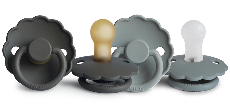 Les sucettes FRIGG Daisy sont disponibles avec une tétine en silicone de qualité médicale et en caoutchouc naturel.