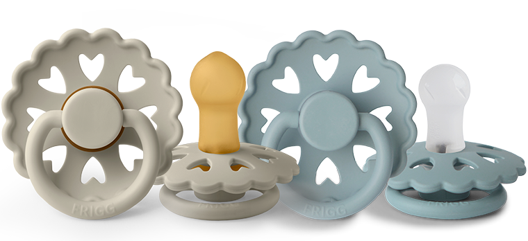 Les sucettes FRIGG Fairytale sont disponibles avec une tétine en silicone de qualité médicale et en caoutchouc naturel.