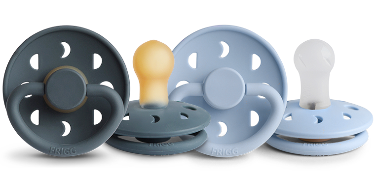 Les sucettes FRIGG Moon Phase sont disponibles avec une tétine en silicone de qualité médicale et en caoutchouc naturel.