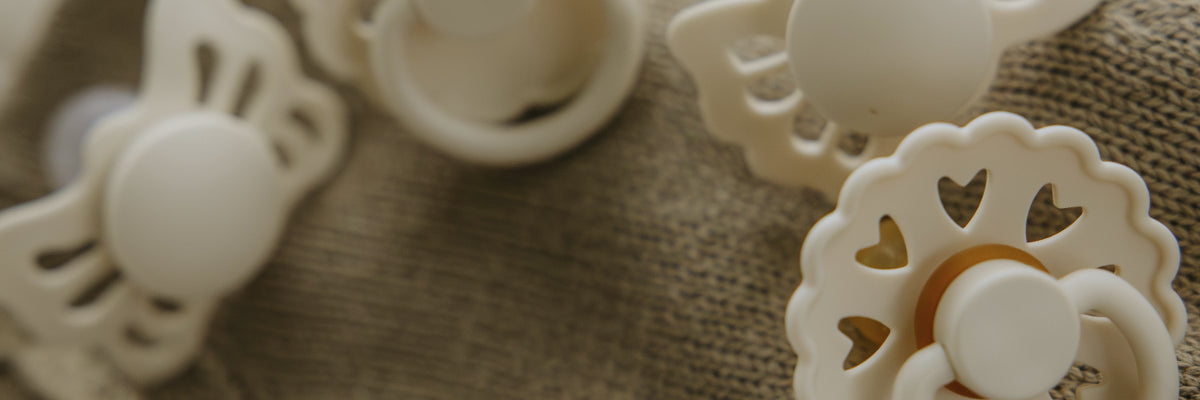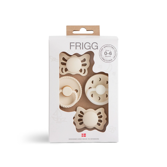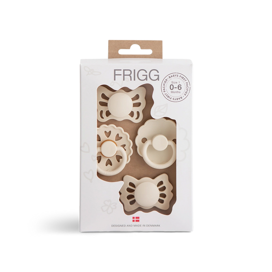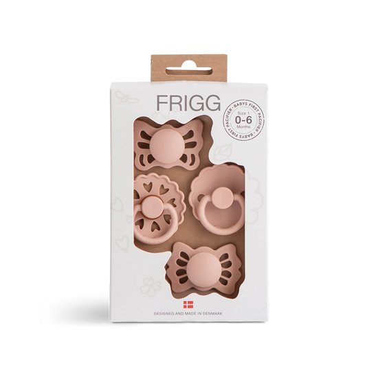 Designed in soft blush and cream tones, each pacifier is a small piece of Danish craftsmanship made to soothe, comfort, and support those early days of bonding. The set includes four beloved FRIGG designs - each with a different nipple type - beautifully packaged in eco-conscious materials.