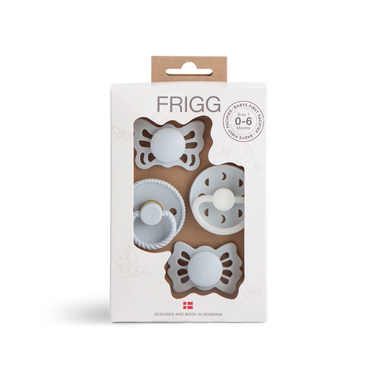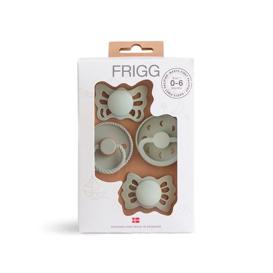 FRIGG’s ‘Baby’s first pacifier’ set consisting of 4 different FRIGG pacifiers with different nipple materials and nipple shapes gives parents the opportunity to try out various pacifiers to find out which one their baby likes the most.