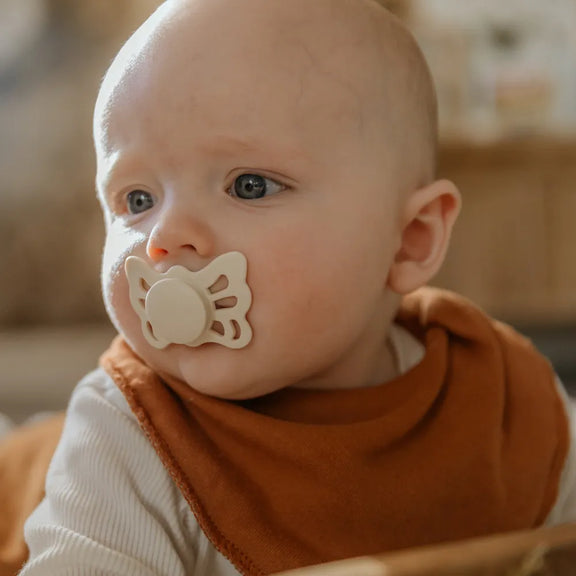 The FRIGG Butterfly pacifier takes its name and shape from one of nature’s most graceful creatures. With wavy edges, a rounded center, and large airholes that mirror delicate wings, the shield resembles a butterfly in mid-flight; light, airy, and beautifully balanced.