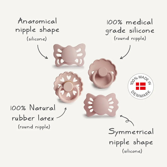 This curated 4-pack brings together FRIGG’s most beloved designs in gentle blush tones and natural sage. Created for newborn comfort and parent peace of mind, every pacifier in this set is made with thoughtful detail and Danish craftsmanship.