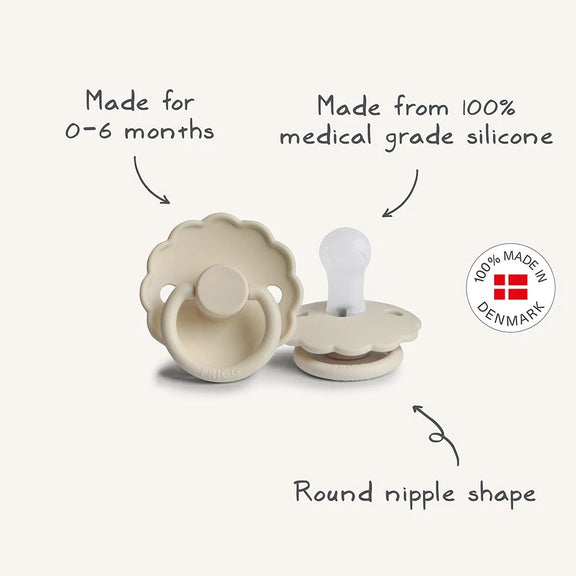 Inspired by Denmark’s national flower, the FRIGG Daisy pacifier combines natural beauty with thoughtful design. The shield’s soft, scalloped edges mimic the delicate petals of the daisy – a flower that carpets Danish meadows in summer and symbolizes innocence, purity, and resilience.